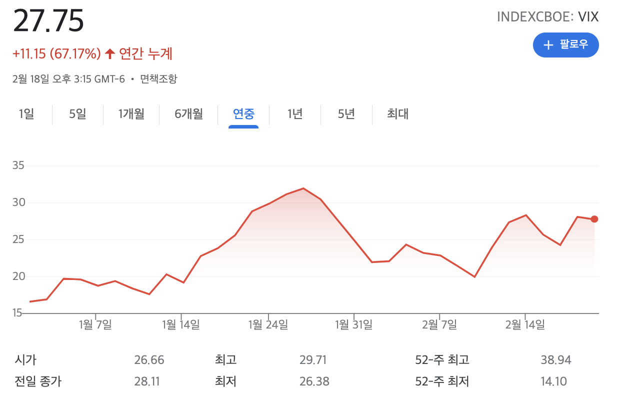 변동성 지수(VIX)는 향후 30일간 S&P500 지수가 얼마나 변할 것 같은지에 대한 투자자의 생각을 반영하는 지표입니다. 전쟁 공포를 가장 잘 반영한다고 볼 수 있죠. VIX 값이 30을 넘으면 증시 변동성이 높아졌다는 뜻으로, VIX 값이 20 미만이면 안정적이고 스트레스가 적은 상태로 봐요.