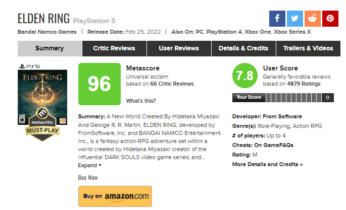 엘든링은 출시되기 전부터 전 세계 게이머들의 엄청난 기대를 받았어요. 그리고 출시된 직후 메타크리틱 점수 96점이라는 엄청난 호평을 받으며 “죽기 전에 꼭 해봐야 할 게임”의 반열에 이름을 올렸죠.